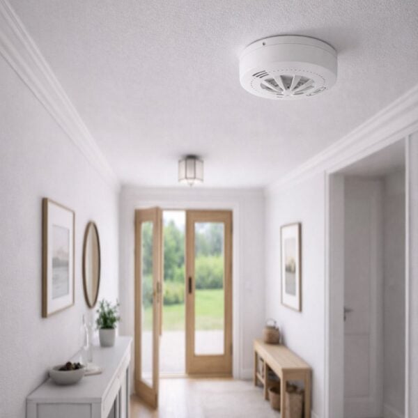 Den diskreta designen gör att detektorn smälter in väl i både bostäder och kommersiella miljöer.