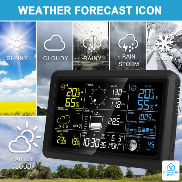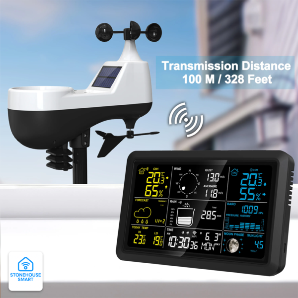Med den avancerade Wi-Fi Pro Väderstationen får du en komplett väder­central för villa, gård eller växthus. Den sol­drivna 7-i-1 utomhus­givaren mäter vind­hastighet, vind­riktning, nederbörd, UV-index, sol­instrålning, temperatur och luft­fuktighet i ett enda robust paket. Tack vare Stonehouse Smart / Tuya Smart kan du följa realtids­data, historiska grafer och AI-prognoser i mobilen – och dessutom automatisera smart-hem-rutiner (t.ex. stäng markiser när UV överstiger 6). Push-larm triggas vid hög/låg temp eller kraftigt regn, medan den stora färgskärmen ger en tydlig översikt i realtid.