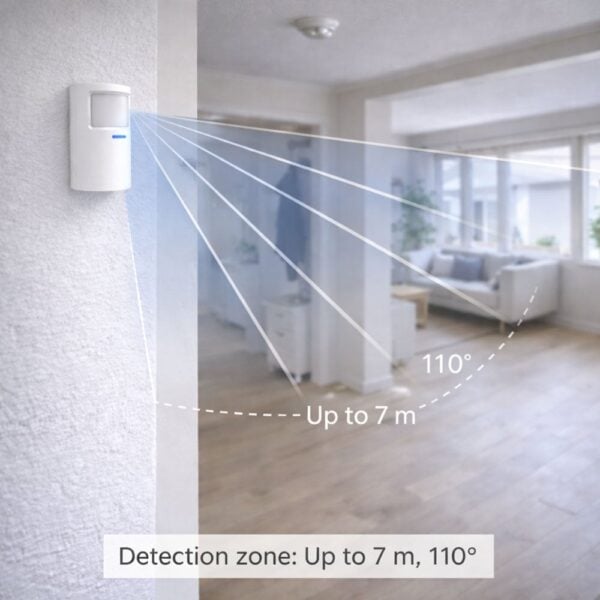 MotionEye Pro har 110° detekteringsvinkel och upp till 7 meters räckvidd, vilket ger exakt och snabb rörelsedetektering. Den stilrena designen passar i hem, kontor och butik och monteras enkelt på 2–2,5 meters höjd med medföljande väggfäste.