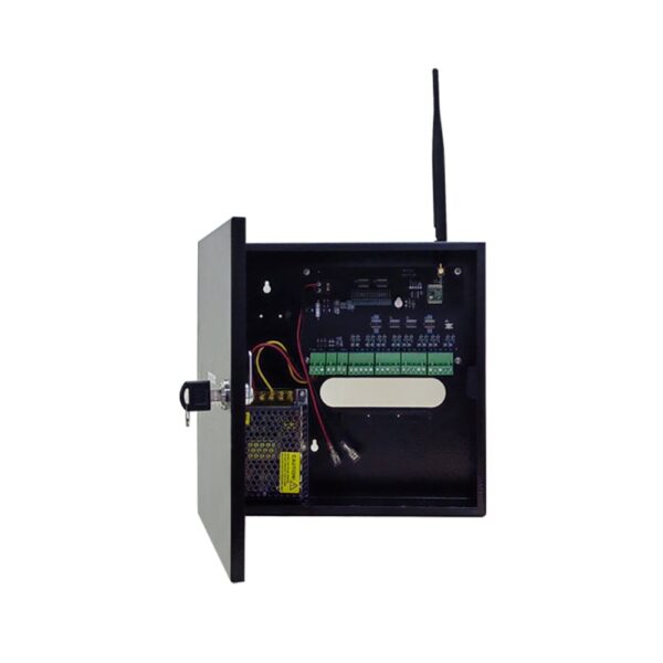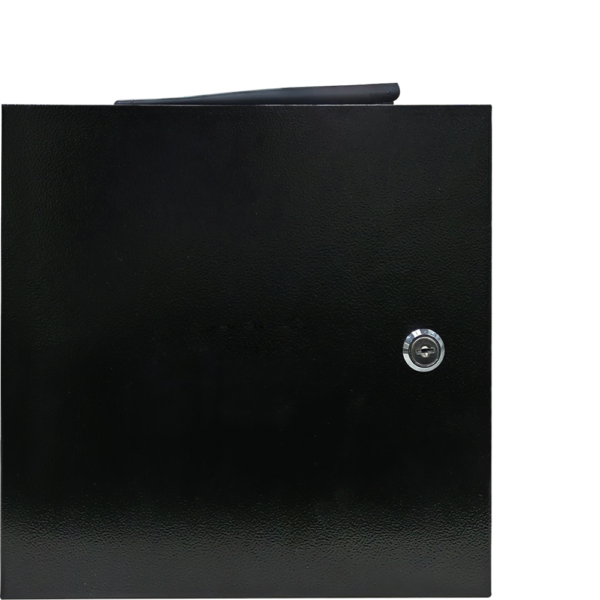 Enheten drivs via DC 15V från 220 VAC-nät (nätadapter ingår och är monterad i kapslingen) och har stöd för externt backupbatteri (12V 7Ah, tillval) för fortsatt drift vid strömavbrott. Inbyggt sabotageskydd och strömavbrottsindikering höjer säkerheten ytterligare.